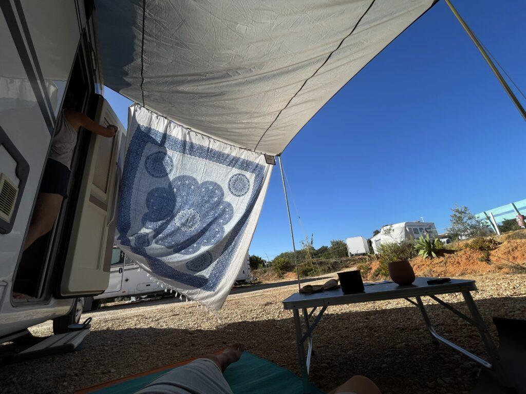Wir kamen auf einem Schotterplatz an, sehr kark. Auch nicht sonderlich schön gestaltet, zwischen wüsten Mülltonnenplätzen an der Straße und Baustellen eines Neubaugebiets am Hügel von Wahlportugiesen. Wir haben geparkt und unser Lager aufgeschlagen. Kaum Schatten. Der kleine Olivenbaum war keine große Abhilfe. Aber wir haben uns schlagartig verliebt!