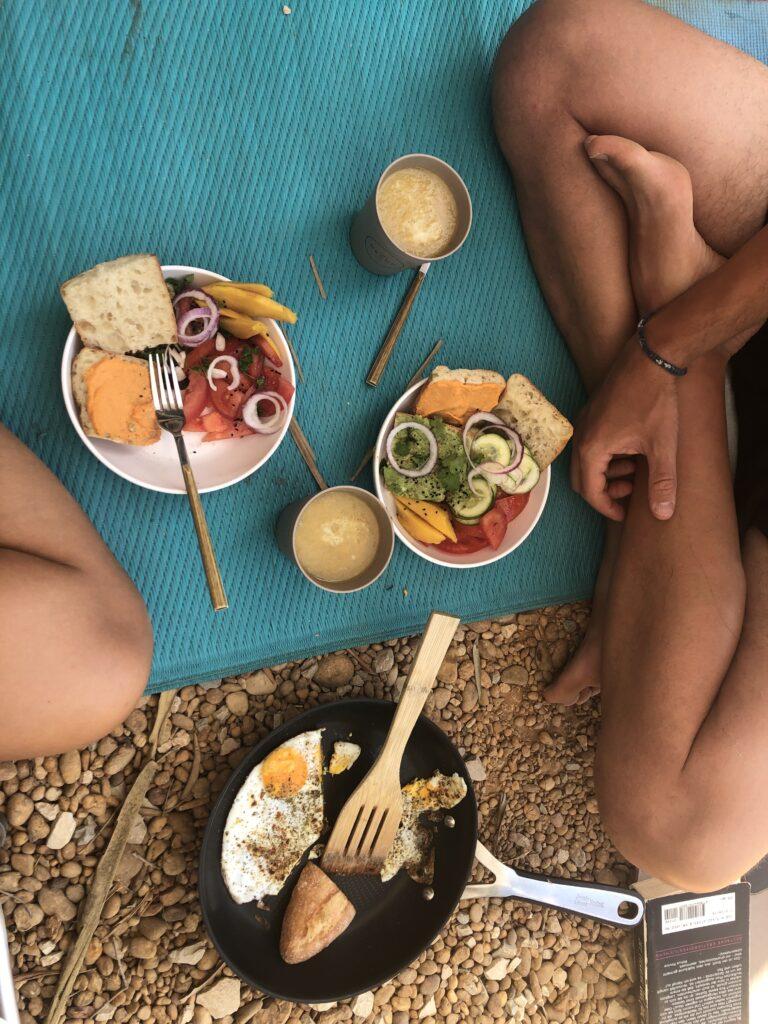 Unsere Erkenntnis ist: Hügelige Landschaft, Strandnähe und so viel Platz, dass der Nachbar möglichst weit weg ist, sind super! Dazu unser kleines Lager aus Teppichen, Yogamatten und Kissen am Boden. Unsere Stühle sind mittlerweile überflüssig geworden. Lieber gesund sitzen und zwischendurch mal in den herabschauenden Hund gehen. Geil! Die Standgebühr von 5 Euro, plus 3 Euro Strom, hat es uns zusätzlich schwer gemacht, weiter zu fahren. Aber irgendwie ging es dann doch wieder los und es sollte eine mega Überraschung auf uns warten!!!